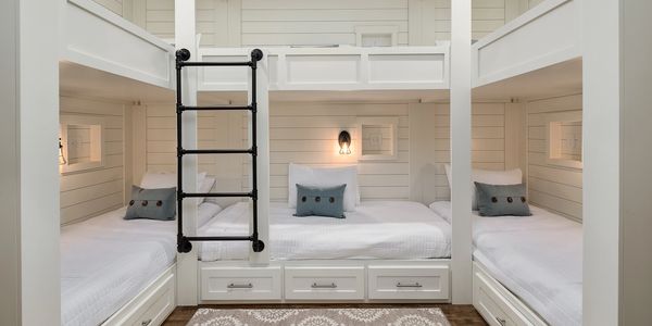 The house features 7 bedrooms (4 king beds, 3 queen beds), 5.5 bathrooms, and two separate bunk rooms, one sleeping six guests and one sleeping four guests.